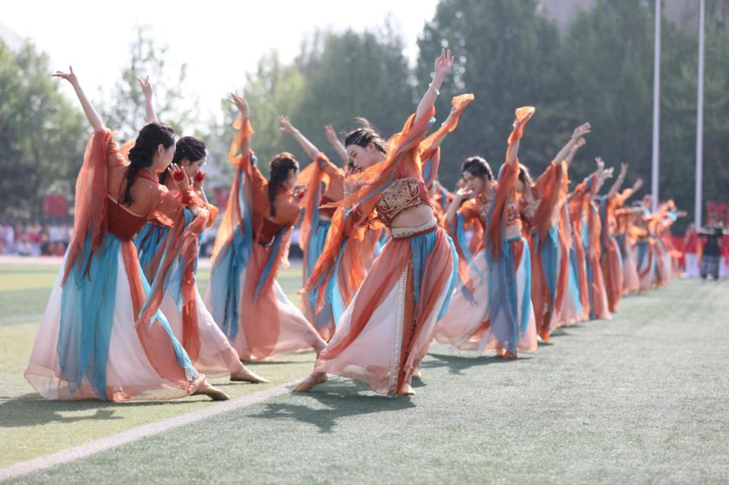 在开幕式的表演环节,教职工带来歌伴舞节目《壮丽航程》,老师们用高亢的歌声唱出伟大祖国的宏伟壮丽,用婀娜的身姿舞出气势磅礴的恢宏旋律,用自己的满腔热忱祝福我们的学校蓬勃发展,扬帆远航。校团委和金融学院团总支指导学生带来的舞蹈《盛世舞千年》,舞者轻盈跃动,如仙子下凡,衣袂飘飘,似流水般灵动。体健学院500名学生带来特色节目《龙腾盛世》,同学们高擎红旗,摆出“财金强”字样,同学们笑靥如花,洋溢着勃勃生机。2023年全国轮滑锦标赛速滑冠军魏惊骁同学身着轮滑装备高举校旗迎面而来,炫酷的轮滑技艺赢得现场观众的热烈掌声,将开幕式推向高潮。开幕式表演节目精彩纷呈,激扬的歌声和欢呼声响成一片,师生用歌声和舞蹈为新中国成立75周年献上财金人最真挚的祝福!